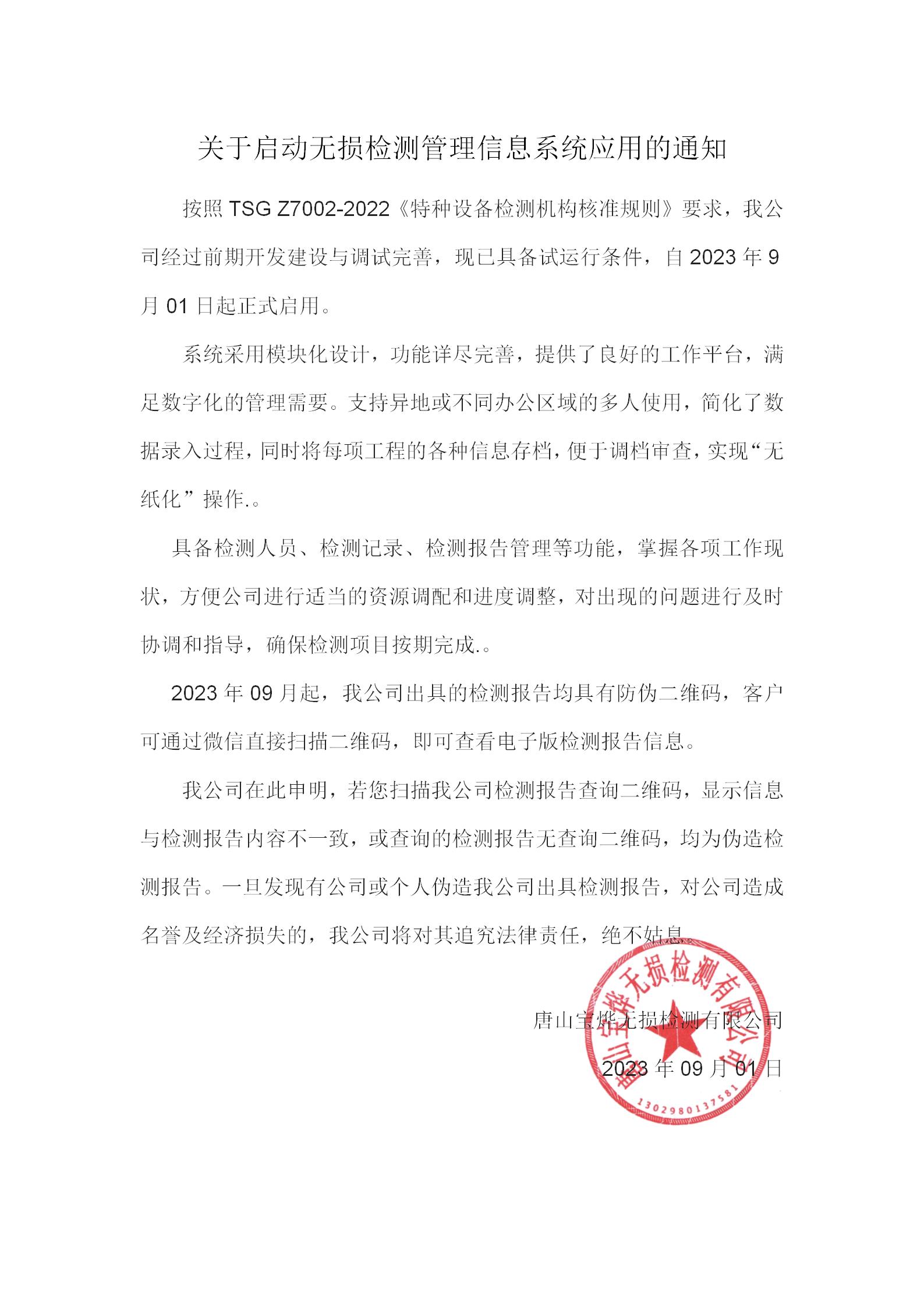 按照TSG Z7002-2022《特種設(shè)備檢測機構(gòu)核準規(guī)則》要求,我公司經(jīng)過前期開發(fā)建設(shè)與調(diào)試完善,現(xiàn)已具備試運行條件,自2023年9月01日起正式啟用。